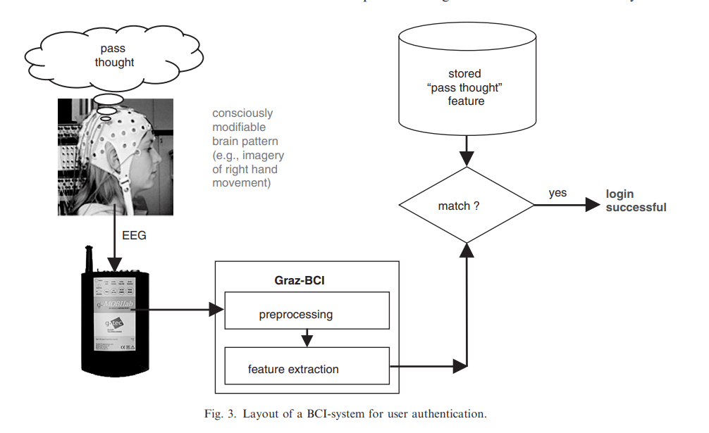 You probably have a PIN code for your ATM card. It has a drawback – anyone can see you enter the numbers and thereby steal your pin. One solution would be to have PIN codes that rely on attention or some other cognitive activity without any movement. People can see which buttons you touch or where your eyes move. They can record voice-based passwords. But a BCI is a completely private way of transmitting information from the brain to another system. Of course, you can always intercept the information further downstream or somehow trick the user into revealing the password like this story. Other work of mine (which is also copyrighted) has an Attentional Personal Identification Number.