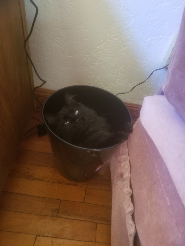 Here, what you learn about the author is that he owns a cat. He interrupted me while I was posting this. So I threw him away. You might think the cat doesn’t look remotely distressed and obviously just trashed himself with disregard for the connotations of trash cans. No! I threw him away. I discipline my cat. Really.