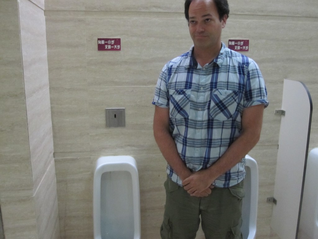 Here is a picture of me next to a urinal in China. The sign says “Please Aim Forward” as if they have a problem with people aiming in other directions. Indeed, that bathroom reeked of urine. Eww.