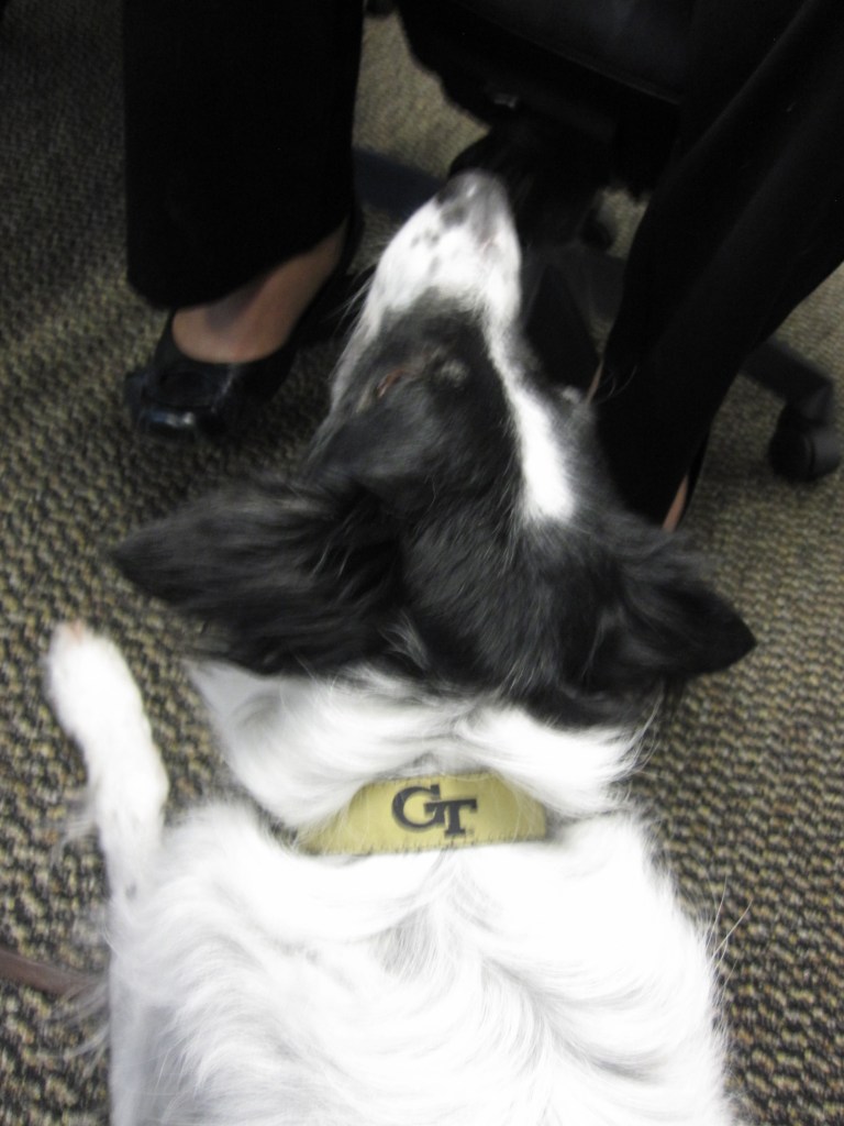 Here’s a picture of her dog Skye wearing an electrode headband we made for him at Georgia Tech. Oddly, you can’t really see the headband but it’s behind his ears. At the time, we had an idea about screening candidates for assistance dog training with EEG. That’s still a good idea today and I don’t think anyone ever implemented it. Assistance dog training is very expensive and only about half those dogs complete training. So, if you could monitor specific signals to identify which dogs would be good candidates (better than current methods), you could save money. We talked a lot about which specific signals and conditions but I’m not gonna repeat it all publicly. Ask me, or Melody.