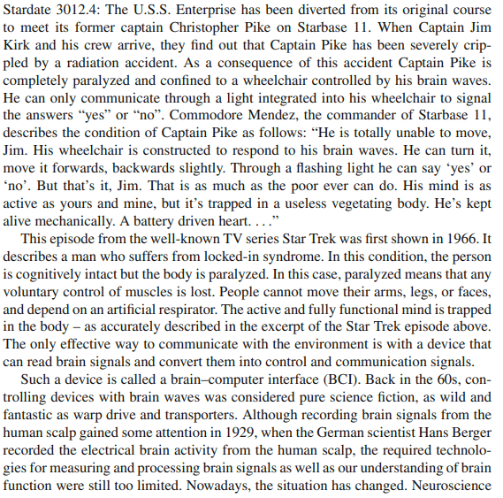 The very first episode of Star Trek featured a BCI, and is one of the best and most realistic portrayals of modern BCIs in any BCI-fi. It’s realistic by modern standards; we’ll hopefully have better BCIs in the 23rd century. Here’s what I wrote about that first episode (Graimann et al., 2009):